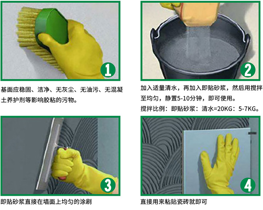 5、底(di)材疏松(song)、吸水性強或表面浮塵臟物難清理,可(ke)先用強力(li)砂(sha)漿添加劑(ji)處理以(yi)有助于粘貼(tie)。