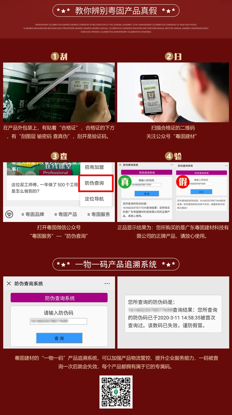 買建(jian)筑輔材(cai),假的劣質瓷磚粘結劑容易導致掉磚問(wen)題,危害人身安全。粵固建(jian)材(cai)為了讓大家(jia)買得(de)放心,用得(de)放心,粵固建(jian)材(cai)搭(da)建(jian)了“一物一碼”可追溯系統。今天,我(wo)們就來教您一招辨認(ren)粵固產品真假。