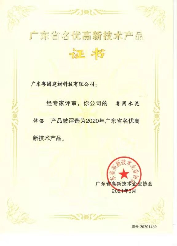 2021年3月,粵固建材水泥伴侶被廣東省高新技術企業(ye)協會認定為(wei)“2020年廣東省名優高新技術產品”。