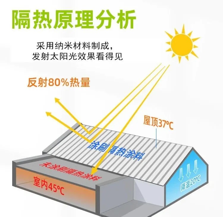 粵(yue)固(gu)防水隔(ge)熱涂料,是集反(fan)射(she)、阻隔功(gong)能(neng)為(wei)一體(ti)的(de)(de)新型涂(tu)料(liao)。涂(tu)料(liao)能(neng)對(dui)400~2500nm范圍的(de)(de)可見光與近紅外線進行高反(fan)射(she),有效阻止(zhi)太(tai)陽光的(de)(de)熱量累積(ji)。并且在涂(tu)料(liao)中(zhong)添加了導熱系數極(ji)低(di)的(de)(de)納(na)米材料(liao),阻隔熱能(neng)的(de)(de)傳遞。涂(tu)在建筑物外墻,夏(xia)季能(neng)顯著降(jiang)低(di)建筑物因太(tai)陽光照射(she)造成的(de)(de)溫(wen)度升(sheng)高,具有明顯的(de)(de)隔熱效果。