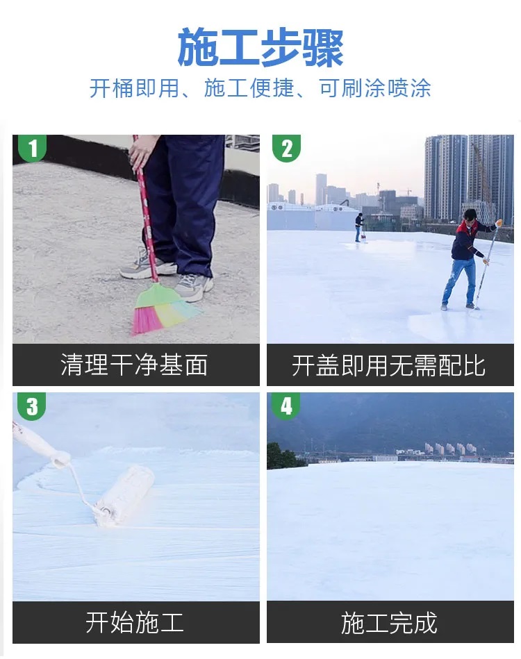 清掃基面后,開桶稍微攪拌后開始涂刷,如果基面起灰掉砂,建議刷一層封底漆,増加涂料與基層的結合力,防止浮灰返堿。接著在基面上涂刷一遍粵固防水隔熱涂料,等待干透后,再涂刷第二遍即可。