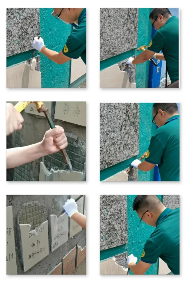 最后,是對粵固產品鋪貼效果進行親身檢驗,使用粵固產品鋪貼的瓷磚,經過多年日曬雨淋,依舊穩固鋪貼在墻上。每位員工輪番打砸,親自感受產品性能,讓新員工對粵固產品的質量有了全新的認識。