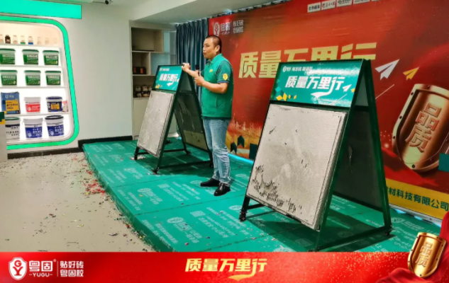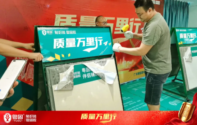 由質量監督員鋪貼完成的瓷磚樣板與留樣封存樣品將送抵“粵固質量萬里行”清遠站會場,在全場經銷商、渠道商、裝企、建材從業者、瓦工師傅的共見證下,現場觀摩暴力打砸測試,體驗粵固產品卓越品質,感受粵固產品過硬實力!