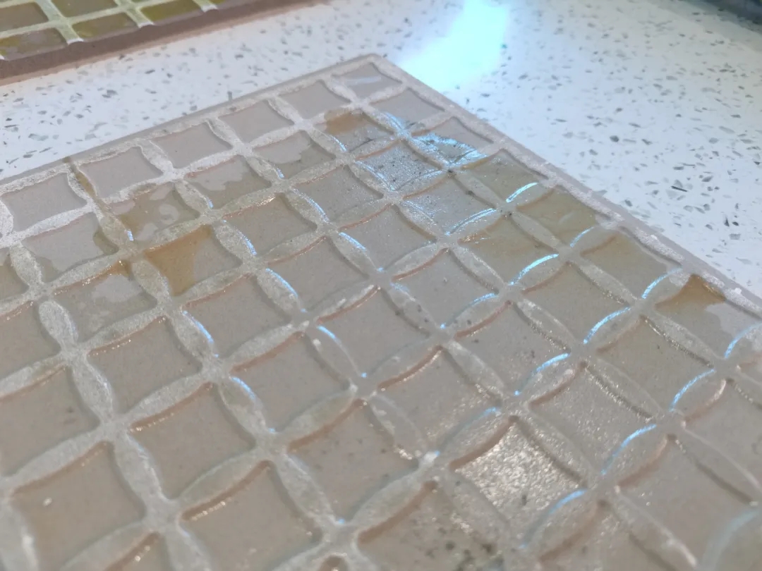 除了鋪貼面積大幅度偏差以外,還可以從水性瓷磚粘結劑膠膜狀態進行判斷,如果使用了摻水的水性瓷磚粘結劑鋪貼的瓷磚,打砸下來后,用手去觸摸水性粘結劑膠膜,會發現膠膜很薄、沒有粘性。這是因為摻入粘結劑的水分被墻體吸收或自行揮發所導致,水分揮發后殘余的膠體被破壞無法成膜,觸摸起來就沒有粘性了。