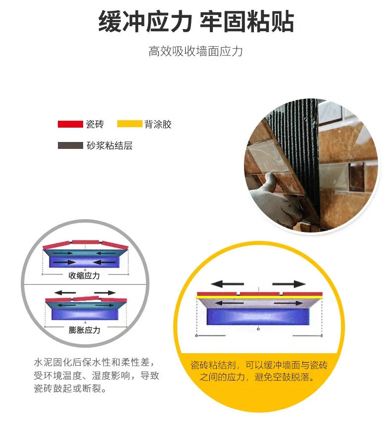 所以判斷瓷磚粘結劑品質好壞并不能但從粘不粘手簡單判斷,而是要從柔韌性、耐候性、耐水性、耐堿性、是否環保等多方面進行考量。