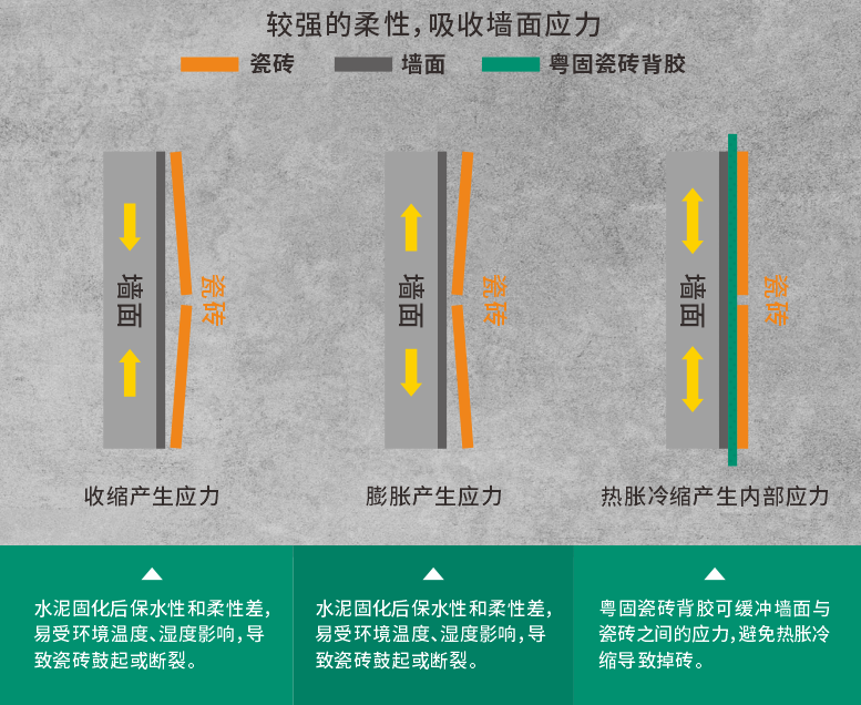 作為瓷(ci)磚(zhuan)(zhuan)和墻面的(de)緩沖層,粵固瓷(ci)磚(zhuan)(zhuan)粘結劑就(jiu)如同一個彈簧(huang)墊,可以緩沖墻面與(yu)瓷(ci)磚(zhuan)(zhuan)之間的(de)應力,減弱墻面形(xing)變(bian)對瓷(ci)磚(zhuan)(zhuan)的(de)影響,避(bi)免因鋪貼材(cai)料(liao)膨脹(zhang)收縮導致瓷(ci)磚(zhuan)(zhuan)上墻易空鼓脫落。