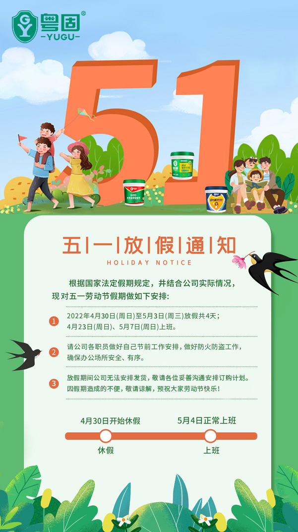 根據國(guo)務院辦公(gong)廳(ting)發出關(guan)于(yu)2023年部分節(jie)假日安排的(de)通(tong)知結合(he)公(gong)司實(shi)際情況,粵固建(jian)材“五一”放假安排通(tong)知如(ru)下: