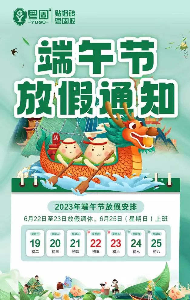 根據(ju)國務院辦(ban)公廳發(fa)出關(guan)于2023年部(bu)分節假日安(an)排的通(tong)知結合公司實際情況,粵(yue)固(gu)建材端午節放假安(an)排通(tong)知如下: