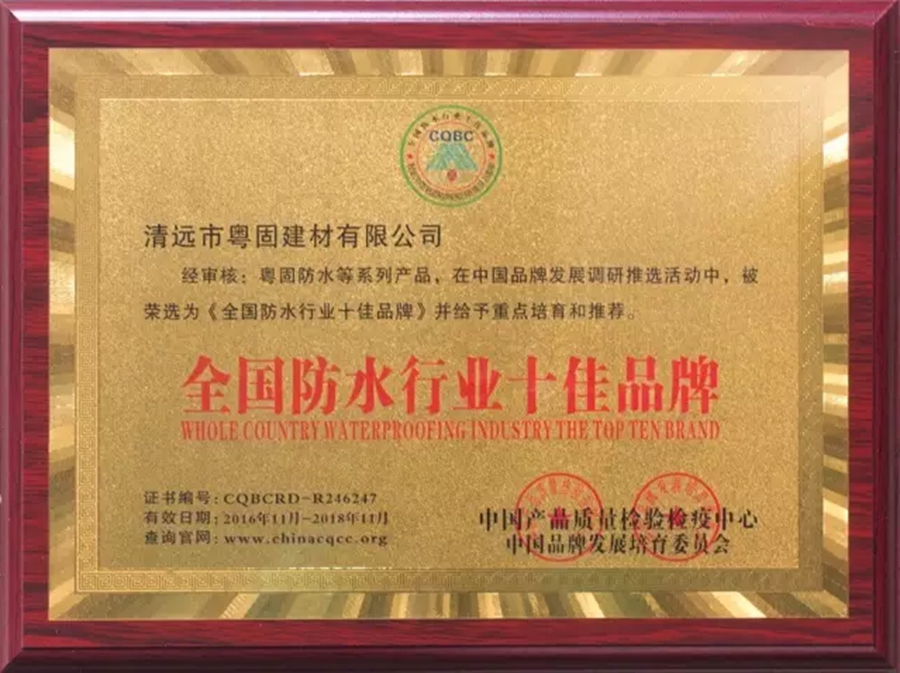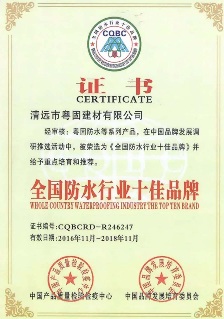經過(guo)中(zhong)國產品(pin)(pin)質(zhi)量(liang)檢(jian)驗檢(jian)疫中(zhong)心與(yu)中(zhong)國品(pin)(pin)牌(pai)發(fa)展培育委員會(hui)綜合考證(zheng),確認我(wo)司符合“全國防(fang)水行(xing)業十佳品(pin)(pin)牌(pai)”的評選要求,授予我(wo)司“全國防(fang)水行(xing)業十佳品(pin)(pin)牌(pai)”的榮(rong)譽稱(cheng)號,并頒發(fa)了榮(rong)譽證(zheng)書和獎牌(pai)。