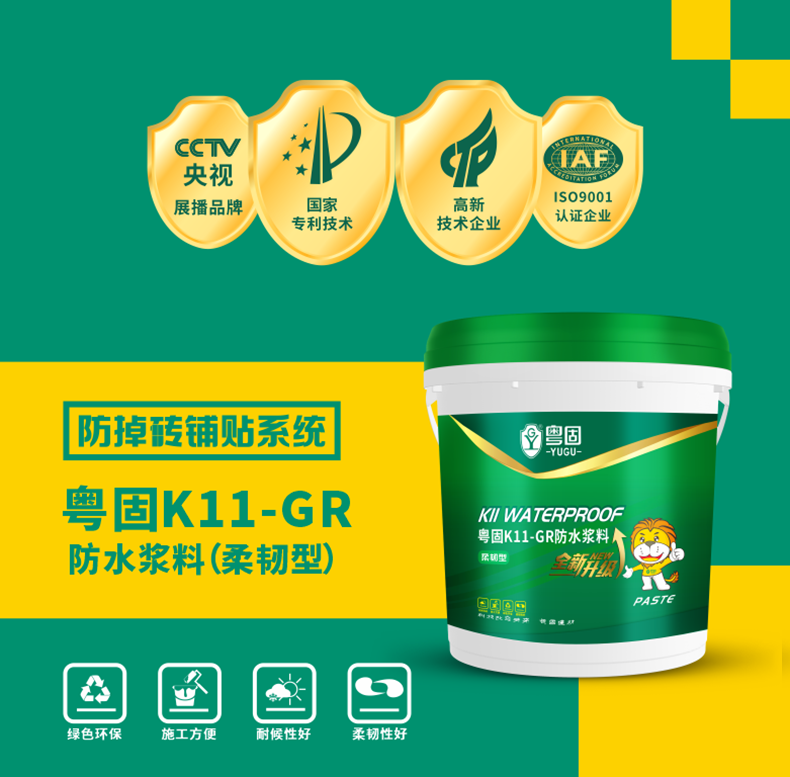 粵(yue)固K11柔韌(ren)型防水(shui)漿料的產品(pin)優點(dian)
